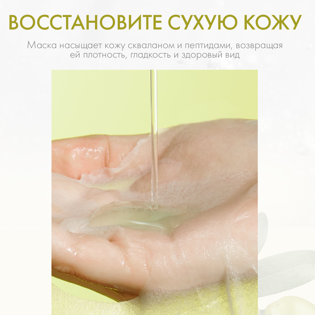 Питательная маска со скваланом и 19 видами аминокислот увлажняет и препятствует появлению сухости и шелушений. Средство усиливает естественные защитные функции эпидермиса, укрепляет его гидролипидный барьер, устраняет воспаление, ускоряет процессы заживления. 19 аминокислот направлены на активное питание сухой кожи, восстанавливают, устраняют микроповреждения и разглаживают кожу. Три вида пептида повышают и поддерживают активность клеток, стимулируют синтез полезных веществ, улучшают структуру и укрепляют матрикс кожи. Сквалан содержит натуральные компоненты и витамины, нормализует работу клеток и налаживает процесс гидратации, чтобы избавить кожу от шелушений. Кожа приобретет здоровое сияние и блеск, а также станет гладкой и шелковистой. Маска рекомендуется обладательницам сухого типа кожи или при состоянии обезвоженности.